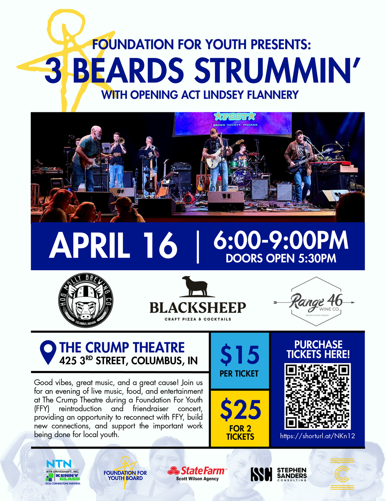 Join us as Foundation For Youth and the Crump Center for the Performing Arts hosts 3 Beards Strummin’ for a fun evening of music, Black Sheep pizza, and Hog Molly brews!